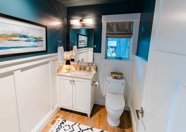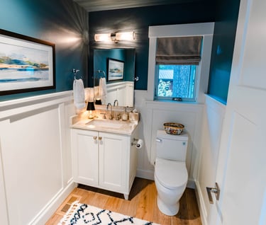 Moody blue powder room off the entry with 4 foot high wainscot detail. Reimagined and rearranged laundry/mud room to maximize flow and efficiency with added storge.