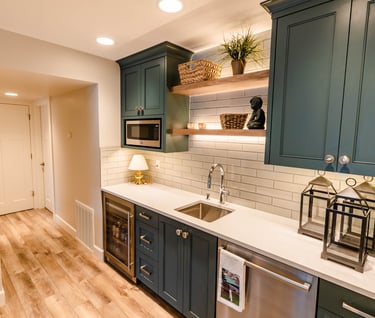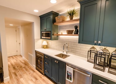 Gorgeous Kensington Grey wet bar- lighted walnut open shelves, handmade glazed tile backsplash. Basement has luxury vinyl plank flooring throughout.