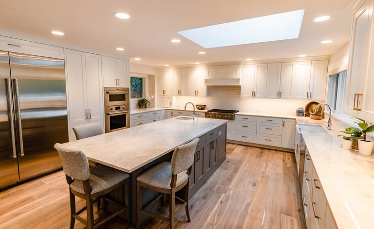 Walls removed in dining room and kitchen for an open floor plan. Soffits removed and custom cabinets carried up to the ceiling with quartzite countertops, farm sink, island wash sink and all new appliances. The gem of the kitchen is the hidden Food Pantry next to the subzero fridge. It looks like a normal cabinet but behind is a six-foot-by-six-foot space with floor to ceiling shelves to organize your life after your Costco trip.